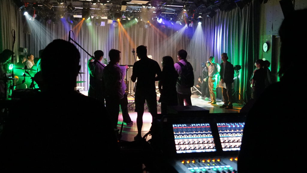 EXTREME immersive LIVEで照明の空間デザイン・プランニング・オペレーターを担当しました。ここでは四方向にスピーカーとステージを設営し、音がさまざまな方向から鳴り響くという異色の演出が行われました。そのため、照明も音の動きに合わせて光を変化させる必要があり、従来の固定的な照明設計とはまったく異なるアプローチが求められました。特に難しかったのは、大学に設置されている照明機材がこのような立体的な展示に対応していなかった点です。追加で多くの灯体を準備し、照射方向を細かく調整しながら、空間全体を生かす照明設計を試みました。デザイン面では、音の方向に合わせて光を動かすだけでなく、あえて人の顔を照らさずに乱雑な配置を取り入れることで、空間全体に動きとデザイン性を持たせる工夫をしました。「音を聞く空間を、光で感じさせる」という意識で、空間そのものをデザインすることを心がけました。